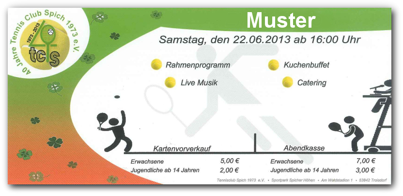 unser Jubiläumsfest steht so gut wie vor der Tür. Aus diesem Grund beginnen wir bereits jetzt mit dem Karten-Vorverkauf. Seid also frühzeitig dabei - sichert Euch für Euch, die Familie, Freunde, Bekannte und Nachbarn einen Platz in der ersten Reihe.